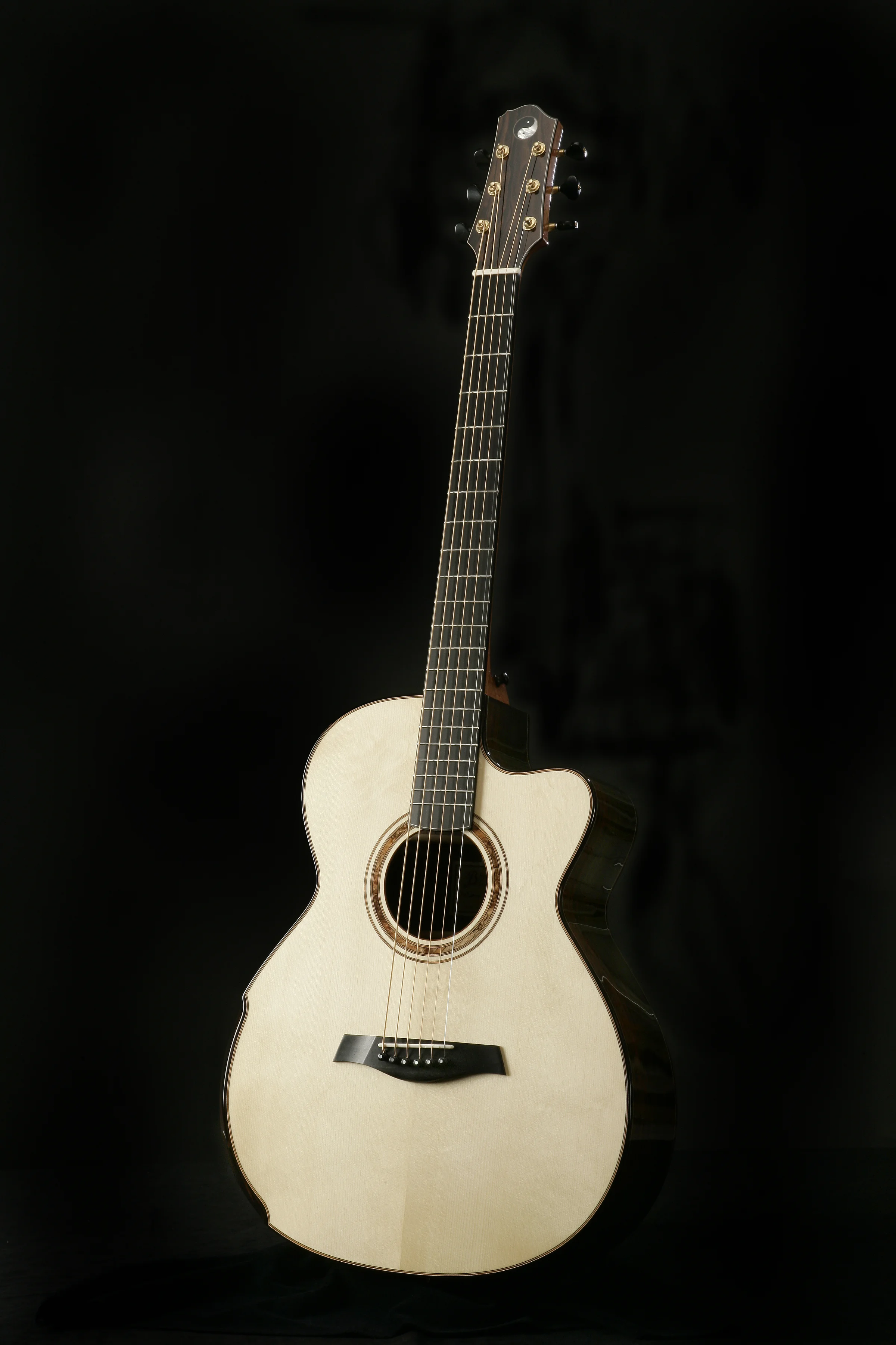 A baritone model with Madagascar Rosewood back & sides, Lucky Strike Western Red Cedar top, finished with Ziricote bindings, Venetian Cutaway, Laskin Rib-Rest and Arm Bevel & Side Sound Port.