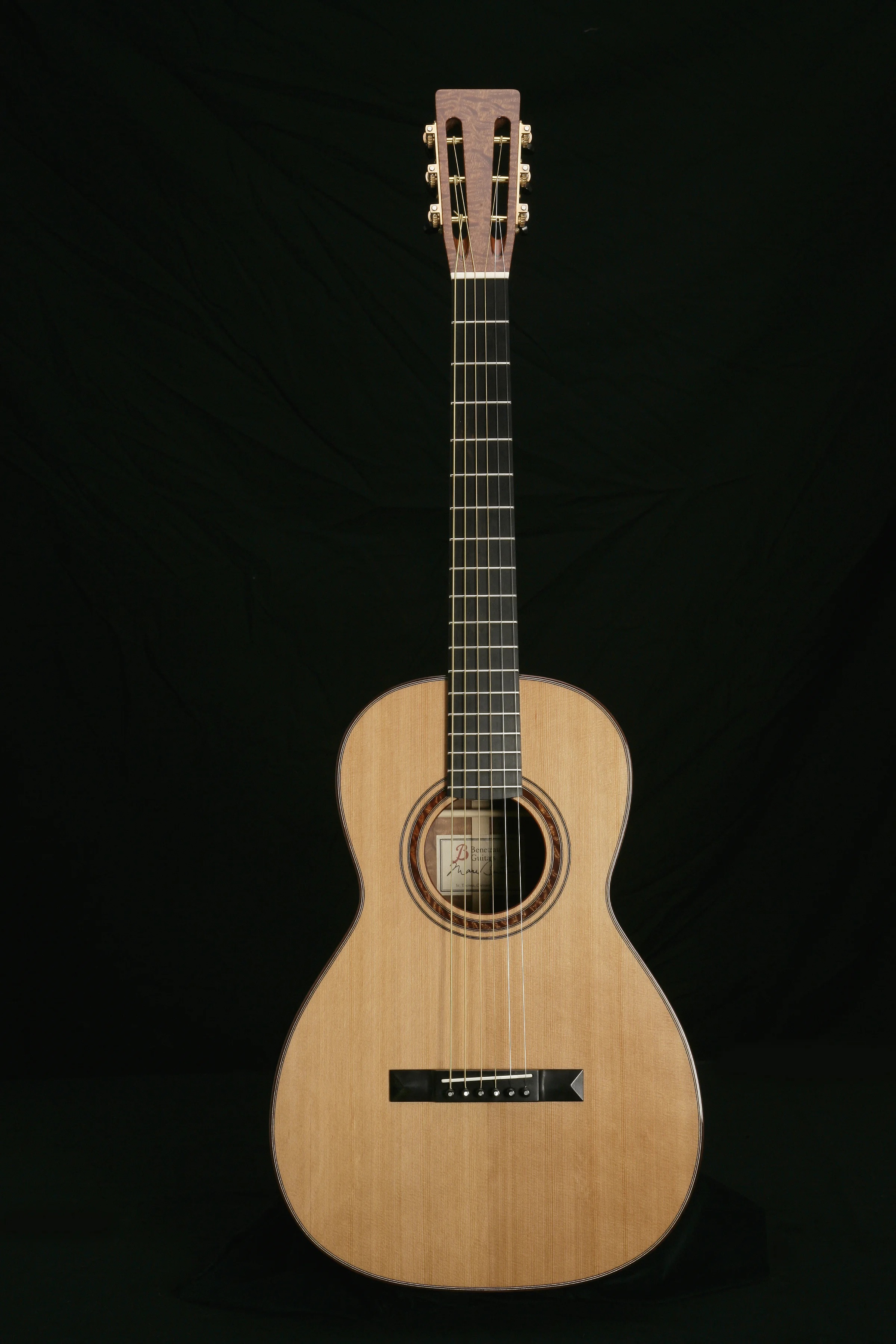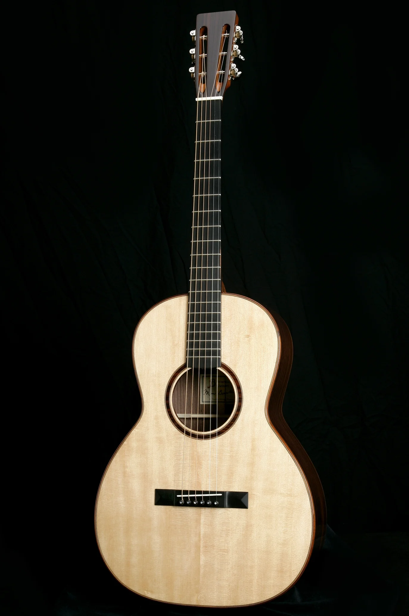 This is the quintessential parlor (parlour) guitar and the smallest model that I build. Extremely comfortable to play – the ultimate couch guitar. Well balanced tone from bass to mids to highs, a wonderful fingerstyle instrument.