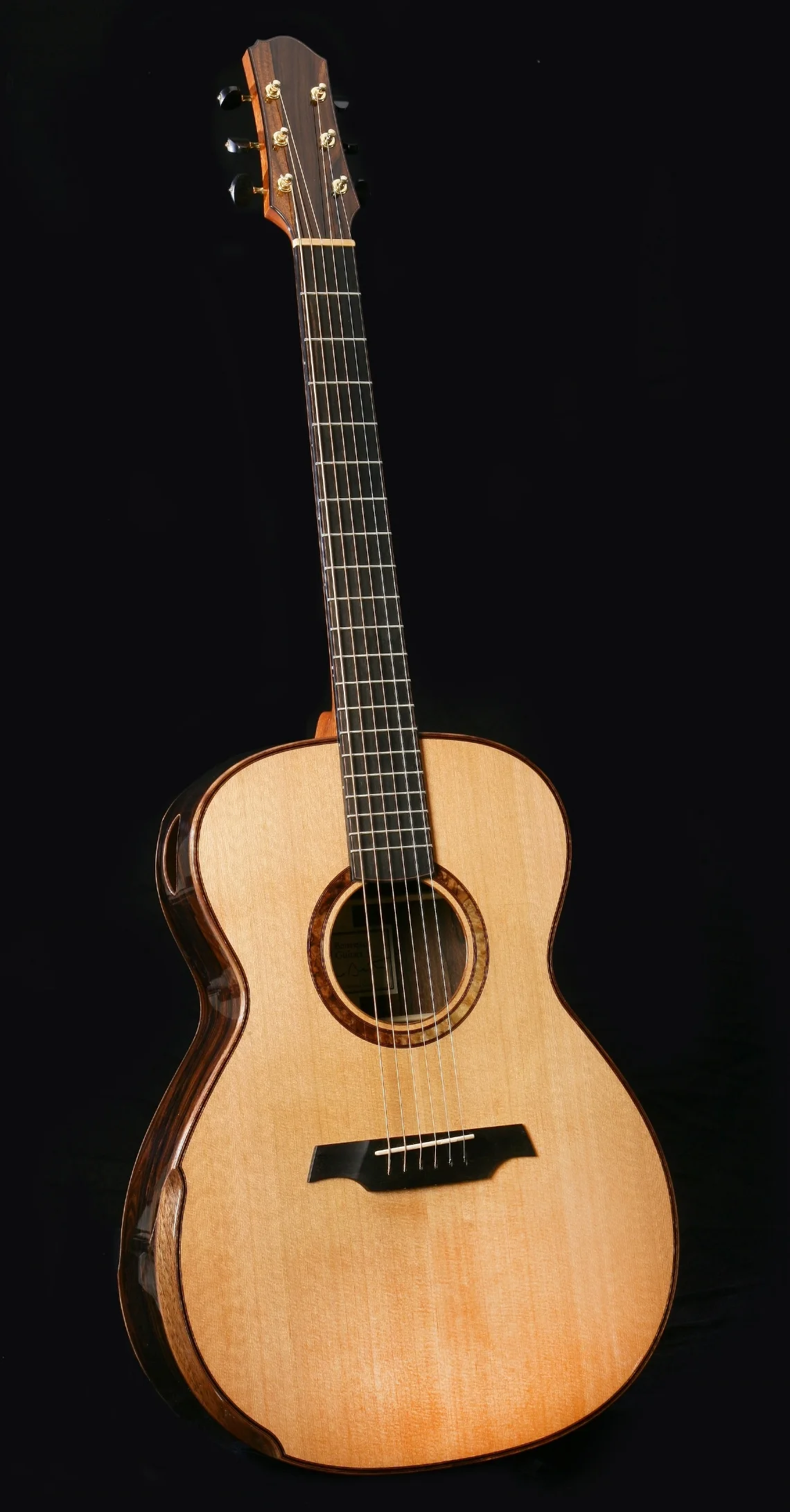 This is arguably the ultimate fingerstyle guitar with strong clear mids and highs. The 15" (38 cm)body is compact and comfortable yet large enough to give a broad tonal response. 14 frets to the body.